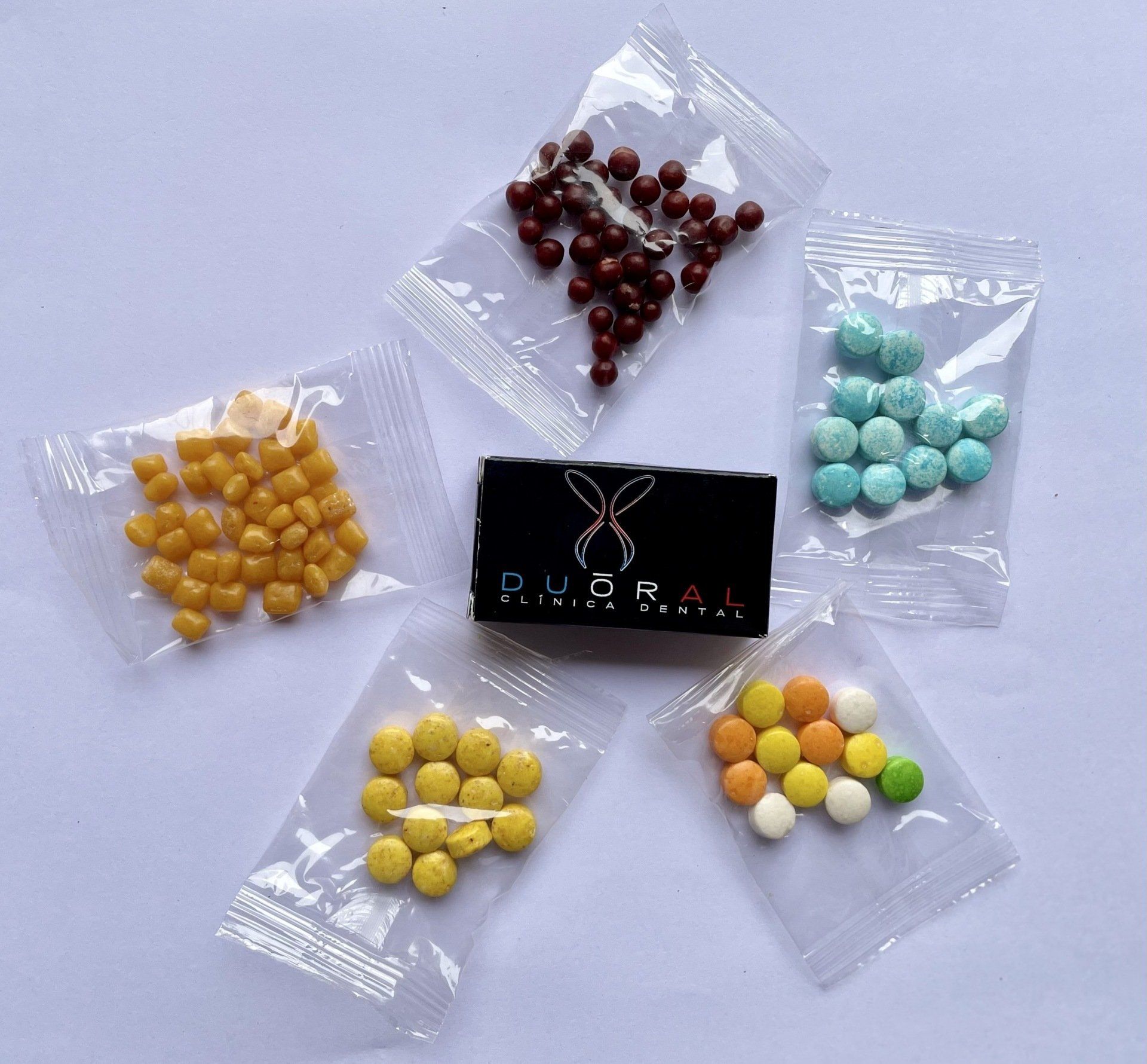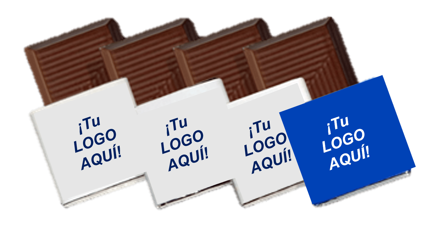 Dulces personalizados: caramelos, pastillas, grageas, chocolates, chicles, paletas con logo impreso en el envoltorio.
